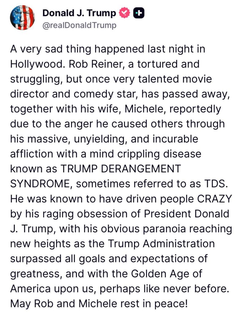Los Angeles police are investigating Reiner and his wife’s deaths as a possible homicide rather than a medical event. According to reports, the couple was fatally stabbed. “A tortured and struggling, but once very talented movie director and comedy star, has passed away, together with his wife, Michele, reportedly due to the anger he caused others through his massive, unyielding, and incurable affliction with a mind crippling disease known as TRUMP DERANGEMENT SYNDROME, sometimes referred to as TDS,” Trump tweeted.
