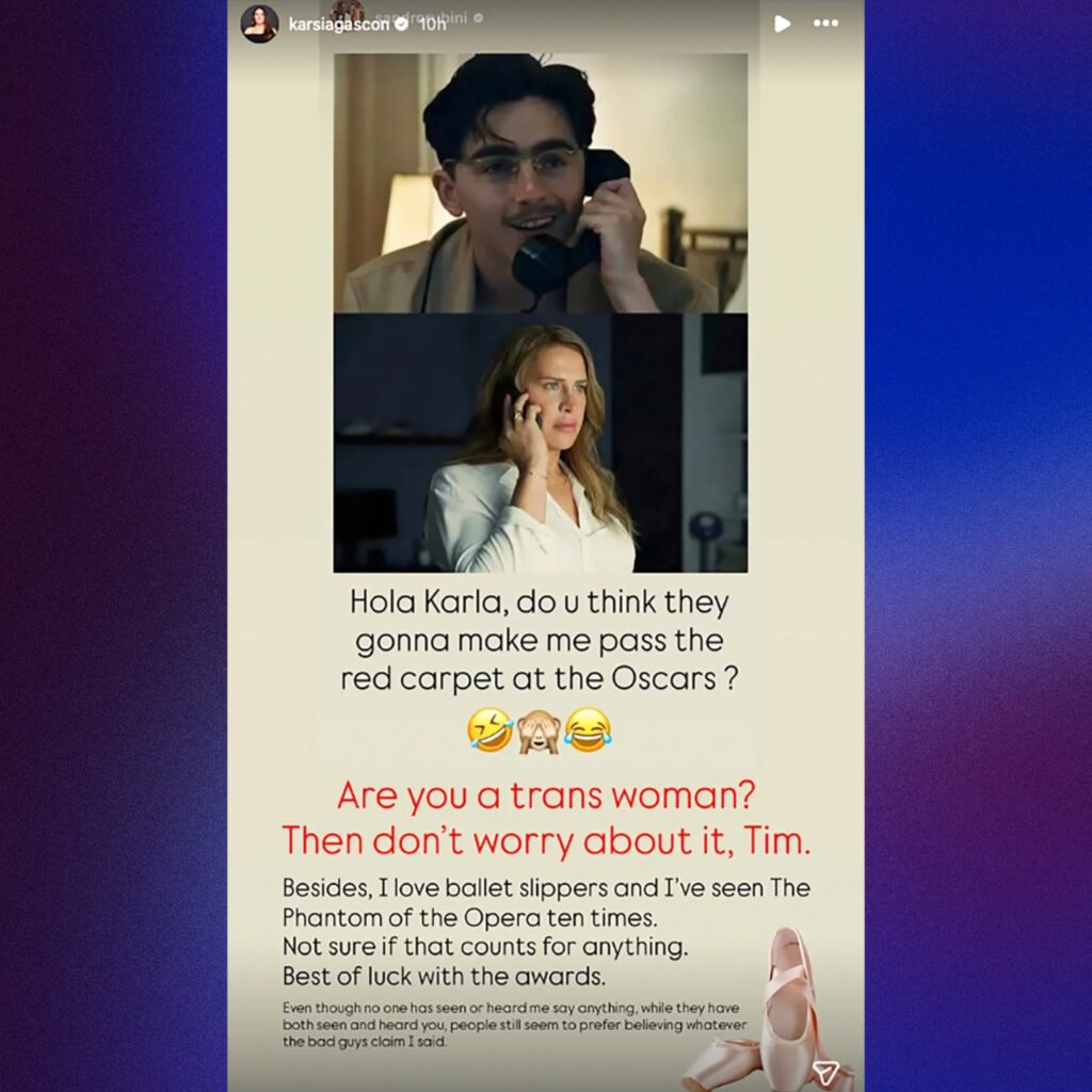 Gascón posted an Instagram image on Monday that blends a photo of Chalamet’s Marty Supreme persona with her own from Emilia Pérez, giving the impression that they are conversing over the phone.